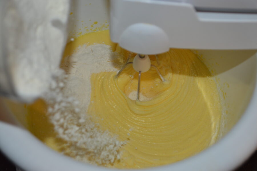 - Turnati treptat amestecul de faina in castron si bateti cu mixerul pana la omogenizare.