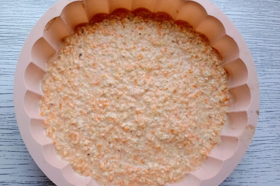 - Turnati aluatul de ovaz intr-o forma de silicon. Coaceti la cuptor 20-25 minute la 180°C.