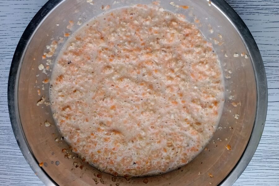 - Turnati laptele cald peste toate ingredientele si lasati la odihnit 15 minute. In acest timp, fulgii de ovaz se vor umfla, iar aluatul va capata o consistenta asemantoare pastei.
