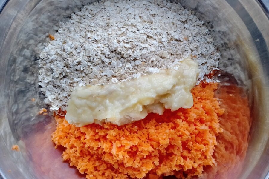 - Tocati morcovii intr-un blender, apoi transferati-i intr-un bol impreuna cu piureul de banane si fulgii de ovaz. Daca fulgii sunt prea mari, este mai bine sa-i tocati si pe ei in blender. Amestecati toate ingredientele.