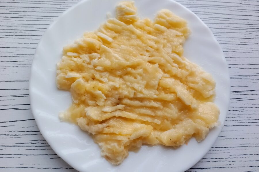 - Decojiti banana, apoi zdrobiti-o cu furculita pana devine piure.