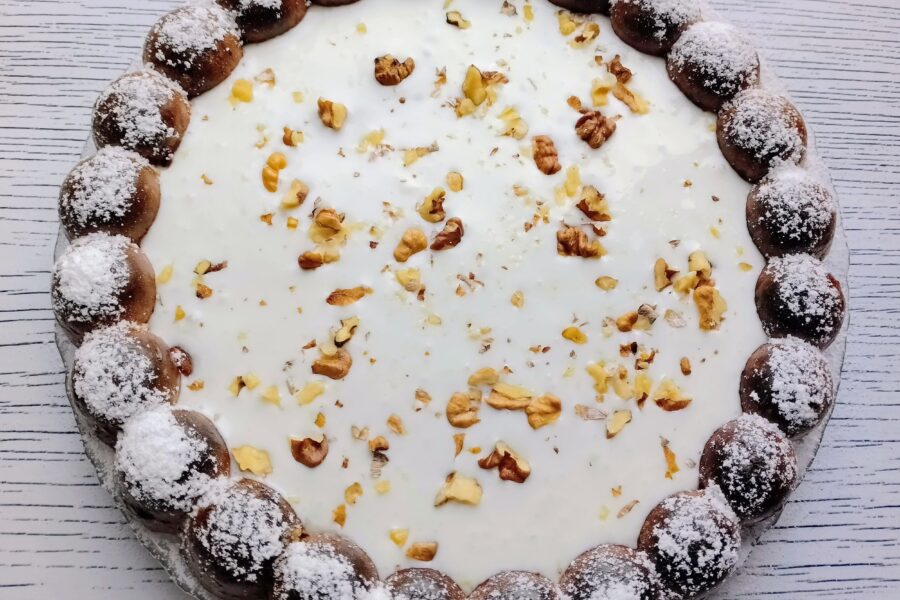 - Ungeti suprafata prajiturii cu smantana groasa si presarati nuci.