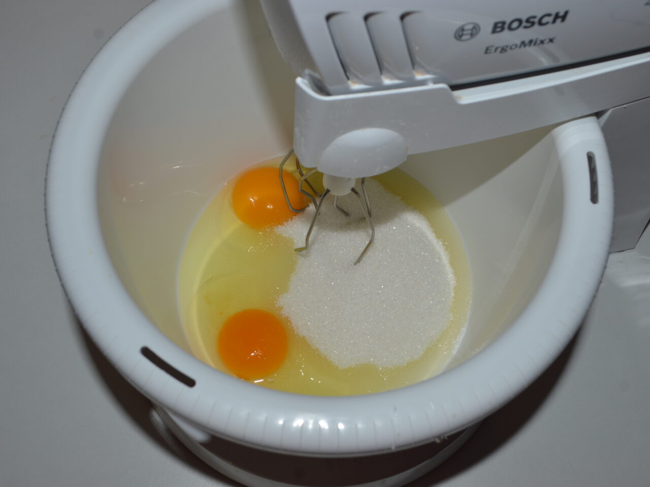 - Bateti cu mixerul ouale cu zaharul.