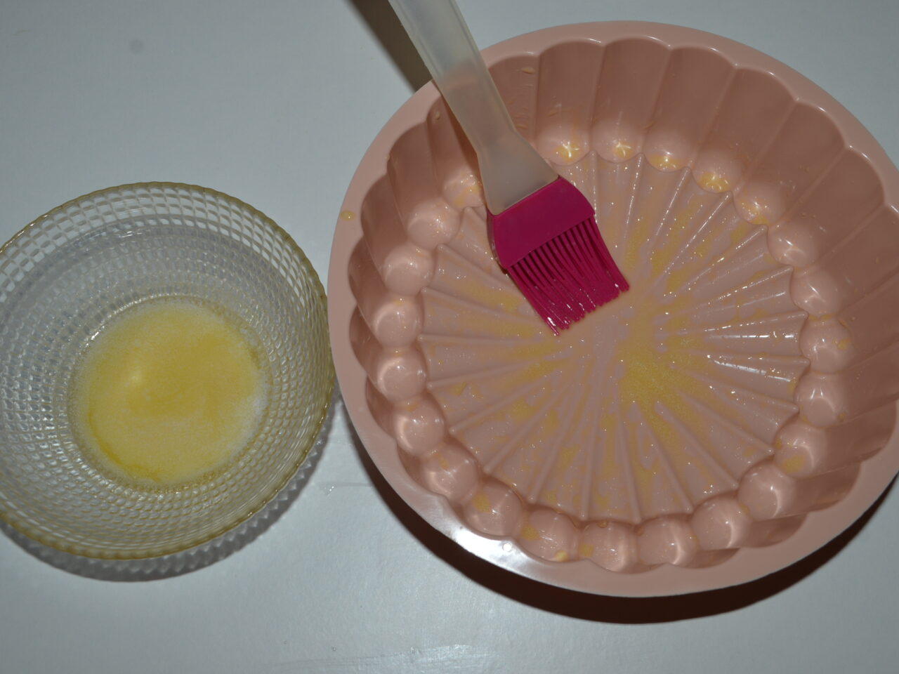 - Topiti putin unt in cuptorul cu microunde, si ungeti cu peria de bucatarie forma de copt. Eu am folosit o forma cu diametrul de 20 cm.