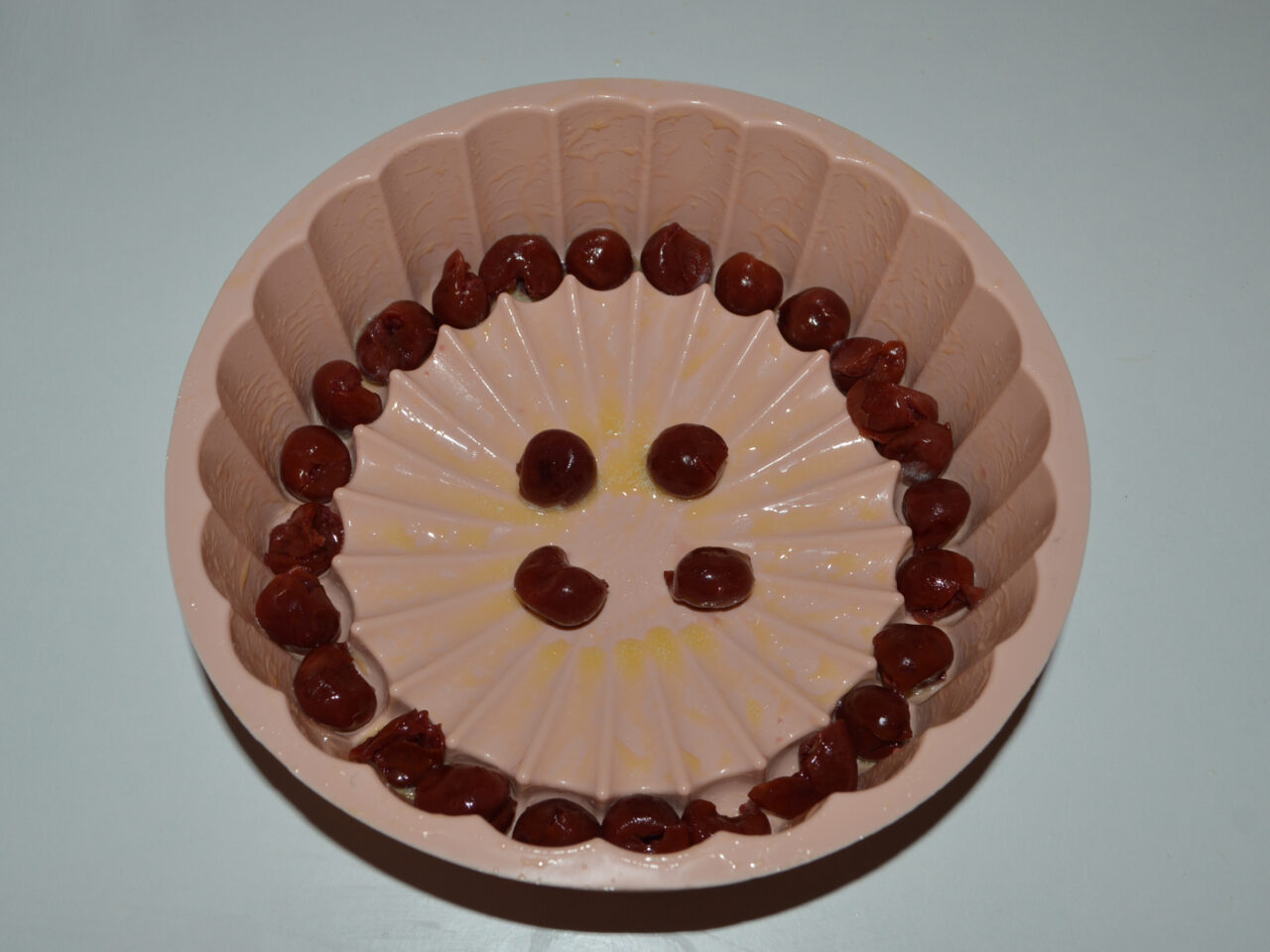 - Aranjati visinele pe suprafata compozitiei in forma. Dati la cuptor la 180 de grade, timp de 35-40 de minute.