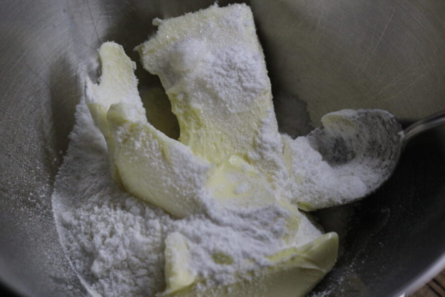 - Mai întâi de toate, pregătiți baza pentru prăjituri. Pentru a face acest lucru, bateți untul moale cu un vârf de cuțit de sare și zahărul pudră până când devine pufos.