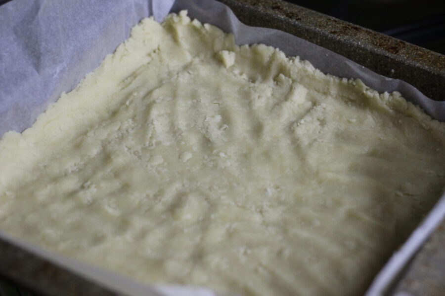 - Întindeți aluatul pe o foaie de copt tapetată cu pergament. Este necesar să se formeze mici laturi. Dimensiunile formei sunt de 20/20 centimetri. Se coace baza la 180 de grade până când devine ușor aurie.