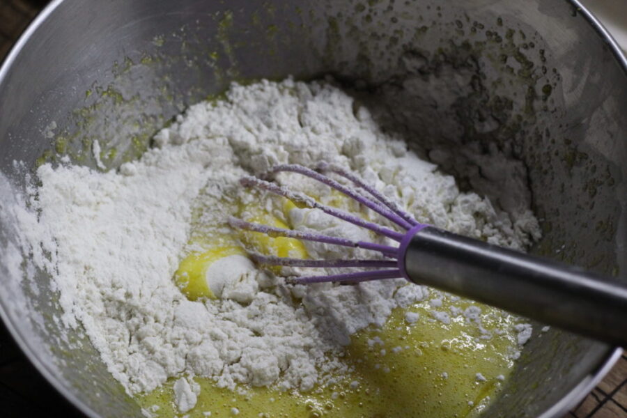 - Se adaugă praful de copt și se cerne făina. Se amestecă ingredientele și apoi se frământă firimiturile până se obține un aluat omogen.