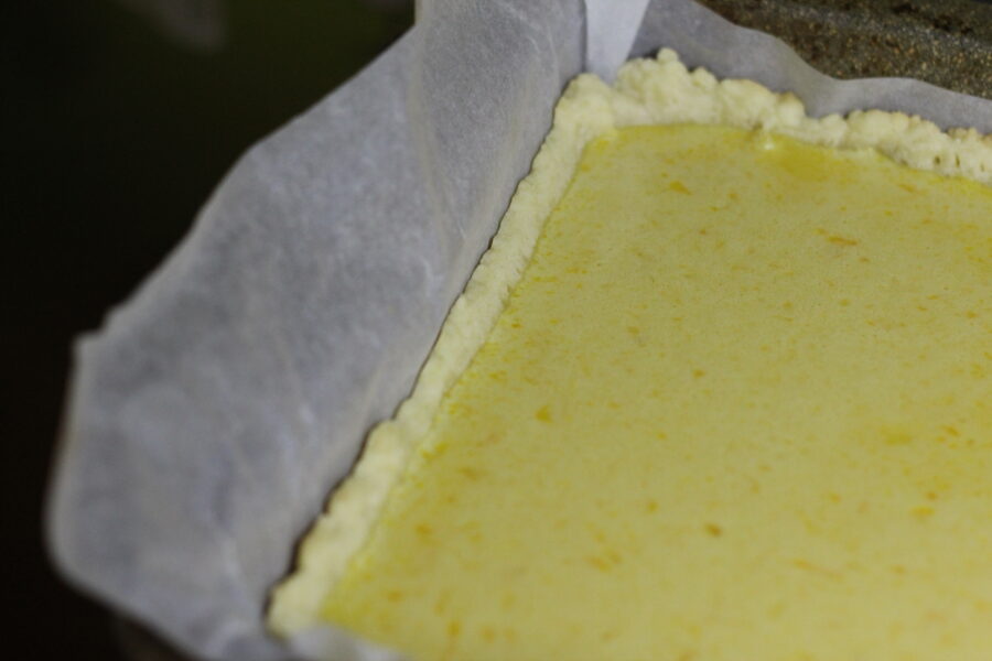- În timp ce baza se coace, se pregătește umplutura. Pentru aceasta, se amestecă ouăle cu zahărul și coaja de lămâie, apoi se adaugă amidonul și sucul de lămâie. Dacă nu aveți amidonul la îndemână, înlocuiți ingredientul cu trei linguri de făină.