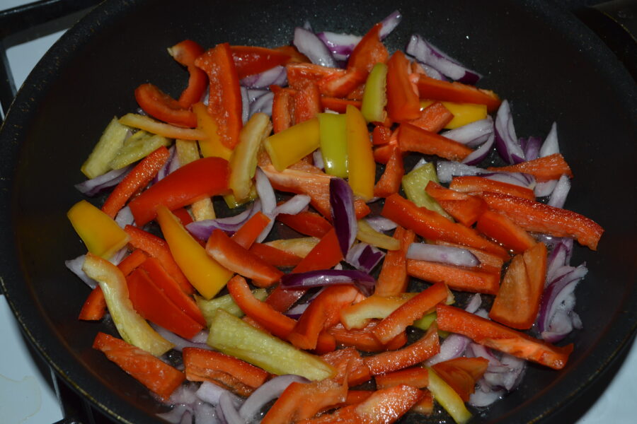 - Incingeti o tigaie cu putin ulei, apoi adaugati ardeii si ceapa. Sotati timp de 5 minute la foc mic, cu capac.
