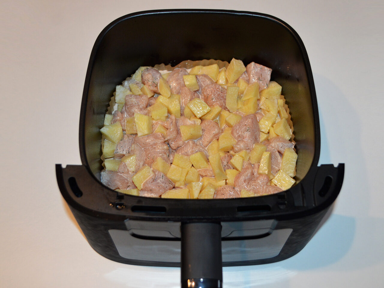 - Asterneti hartie de copt in Air Fryer apoi puneti cartofii si carnea.