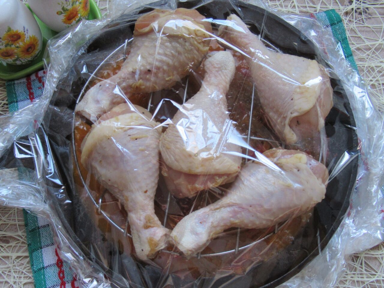 - Spalati pulpele de pui, uscati-le si puneti-le intr-un bol. Preparati marinada din condimente, suc de lamaie, sos de soia si usturoi ras. Turnati marinada peste pulpele de pui, amestecati si lasati la marinat cel putin jumatate de ora. In timp ce carnea absoarbe condimentele, incalziti cuptorul.