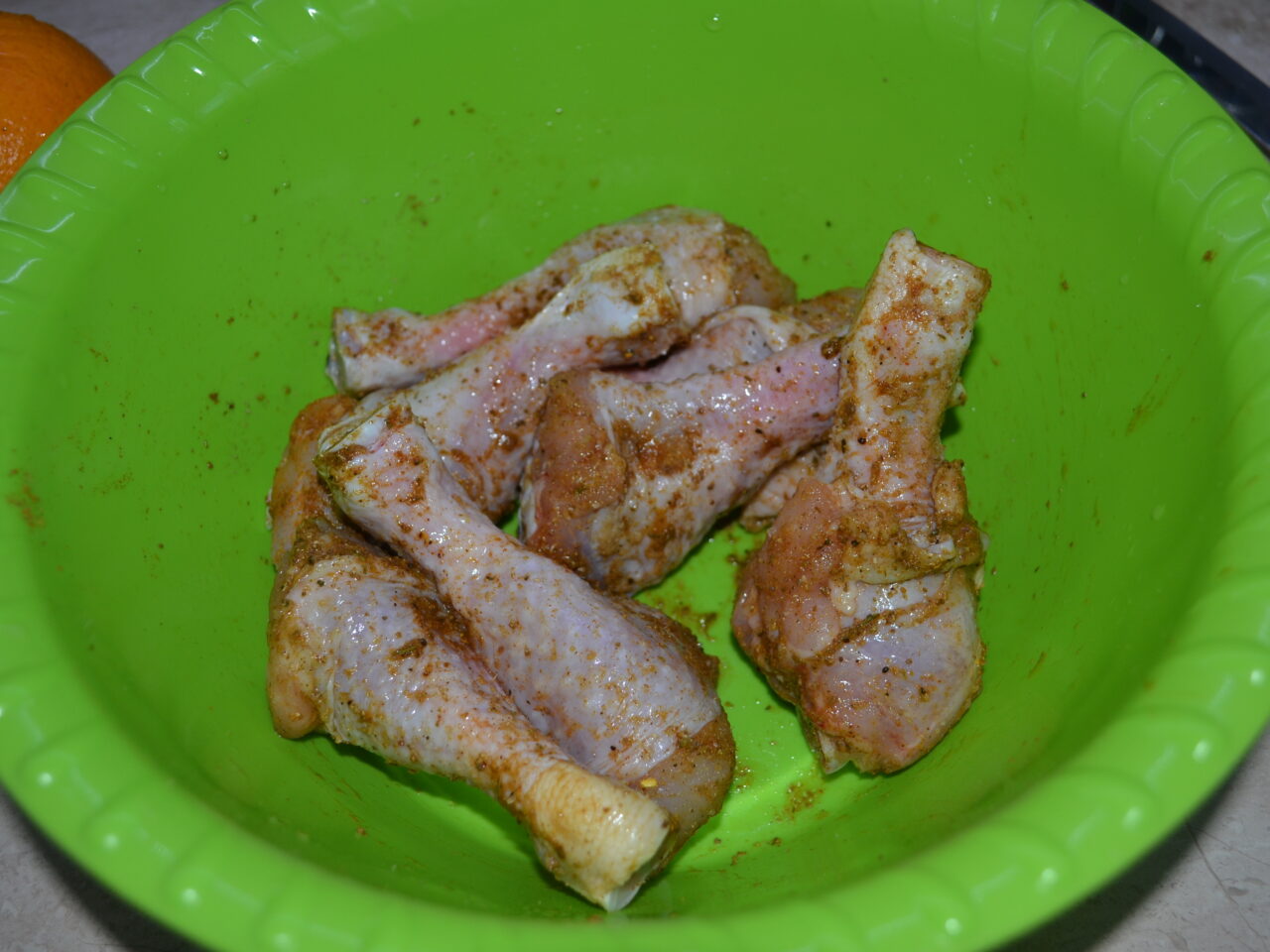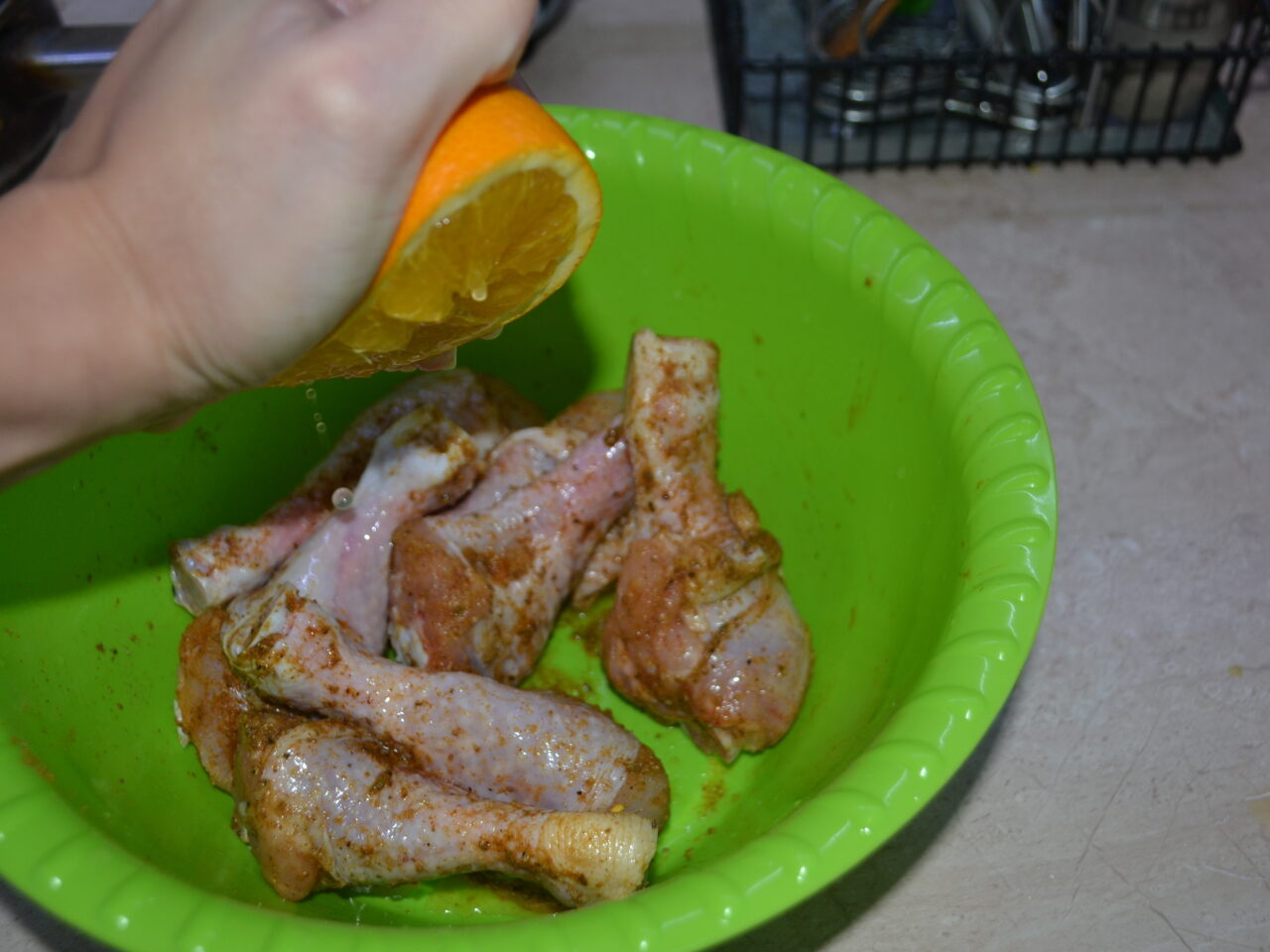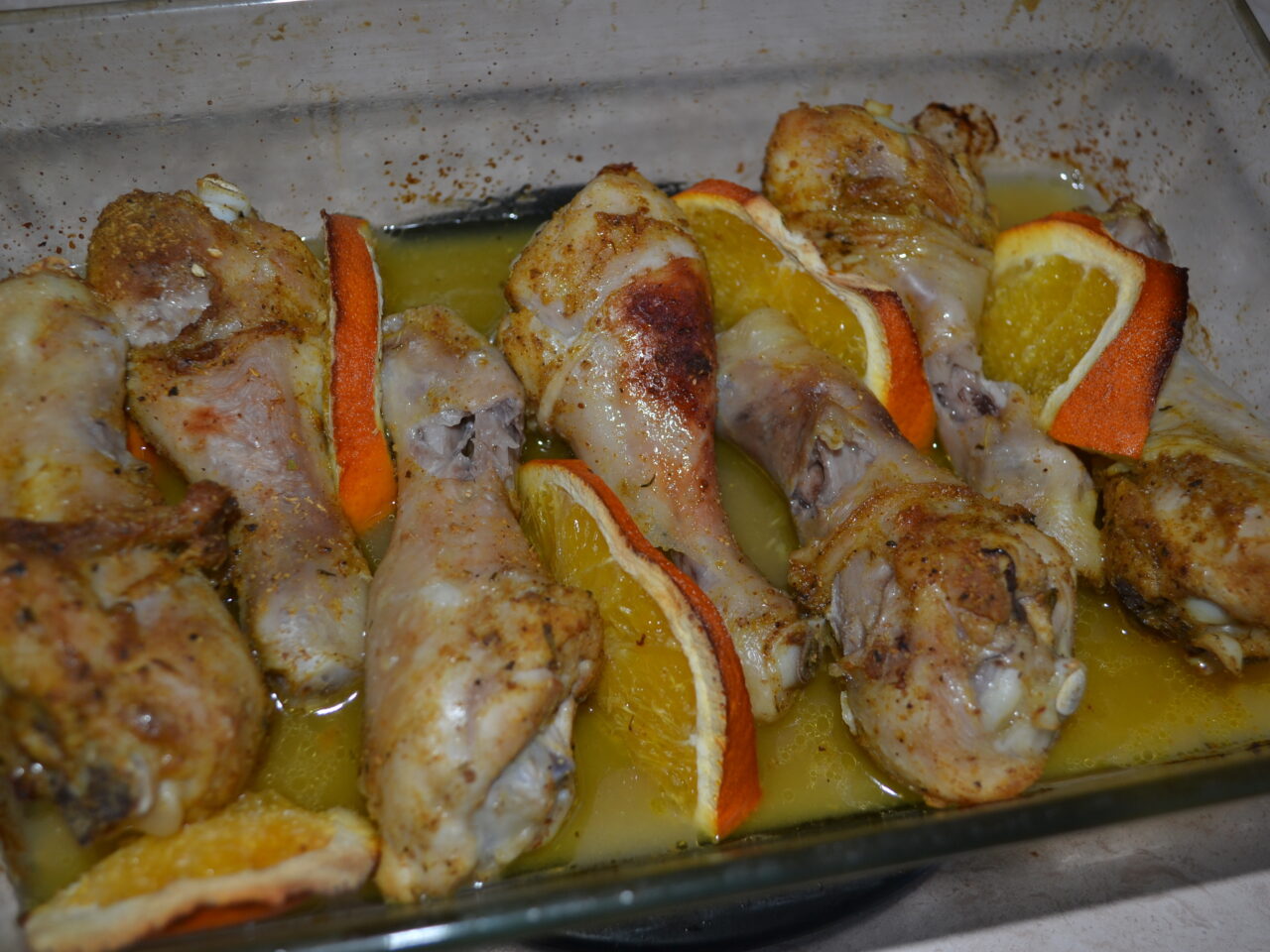 - Unor gospodine le place să adauge puțină miere pentru a obține o crustă crocantă. Tăiați portocala în 2 părți. Stoarceți sucul unei jumătăți într-un recipient cu pulpele murate. Se amestecă totul bine și se lasă la fiert aproximativ 30 de minute.