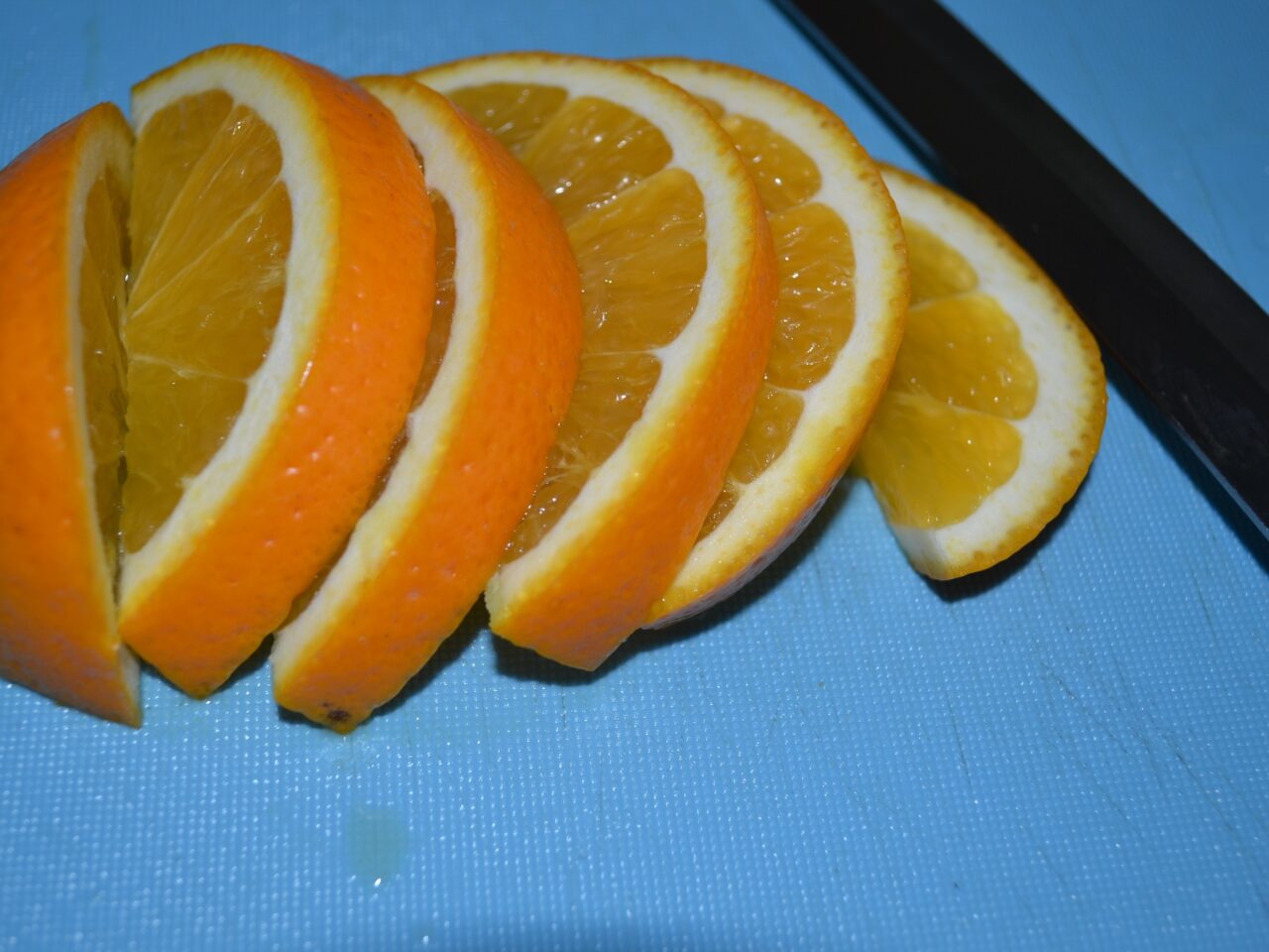 - Tăiați portocala rămasă în felii mari; acestea vor fi necesare la coacerea puiului.