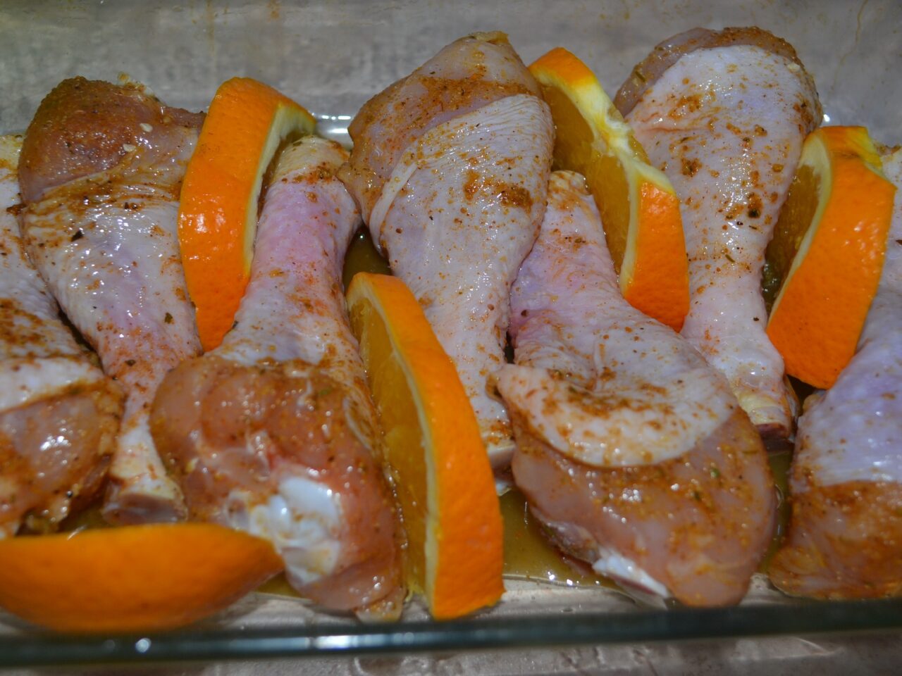 - Turnați puțin ulei de măsline în tava de copt. Acoperiți fundul și părțile laterale ale matriței cu ea. Aranjați pulpele de pui așa cum se arată în poza. Puneți felii de portocale între ele.