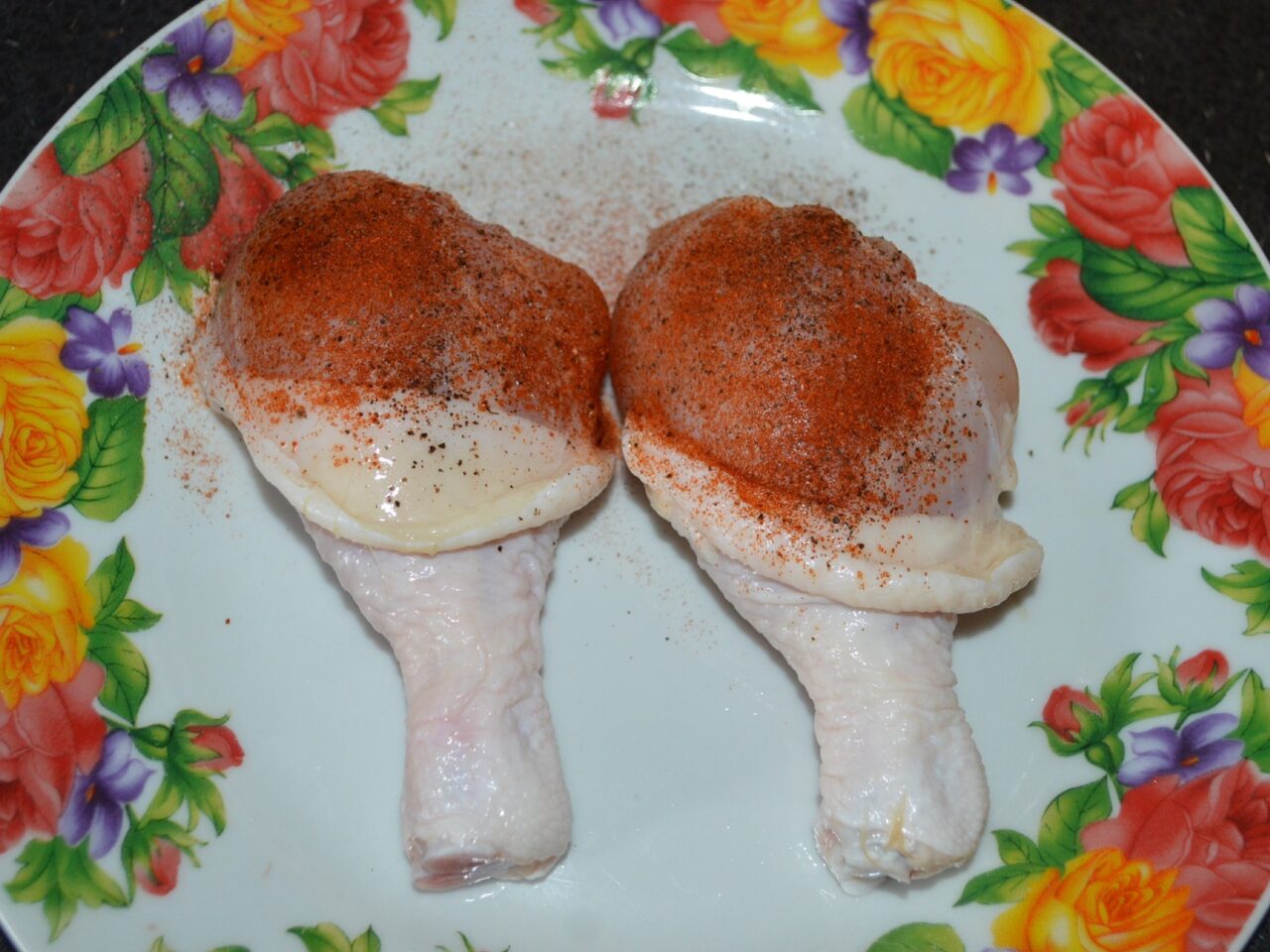 - Spalati pulpele de pui si indepartati putin pielea ca sa presarati sare, piper macinat si boia de ardei.