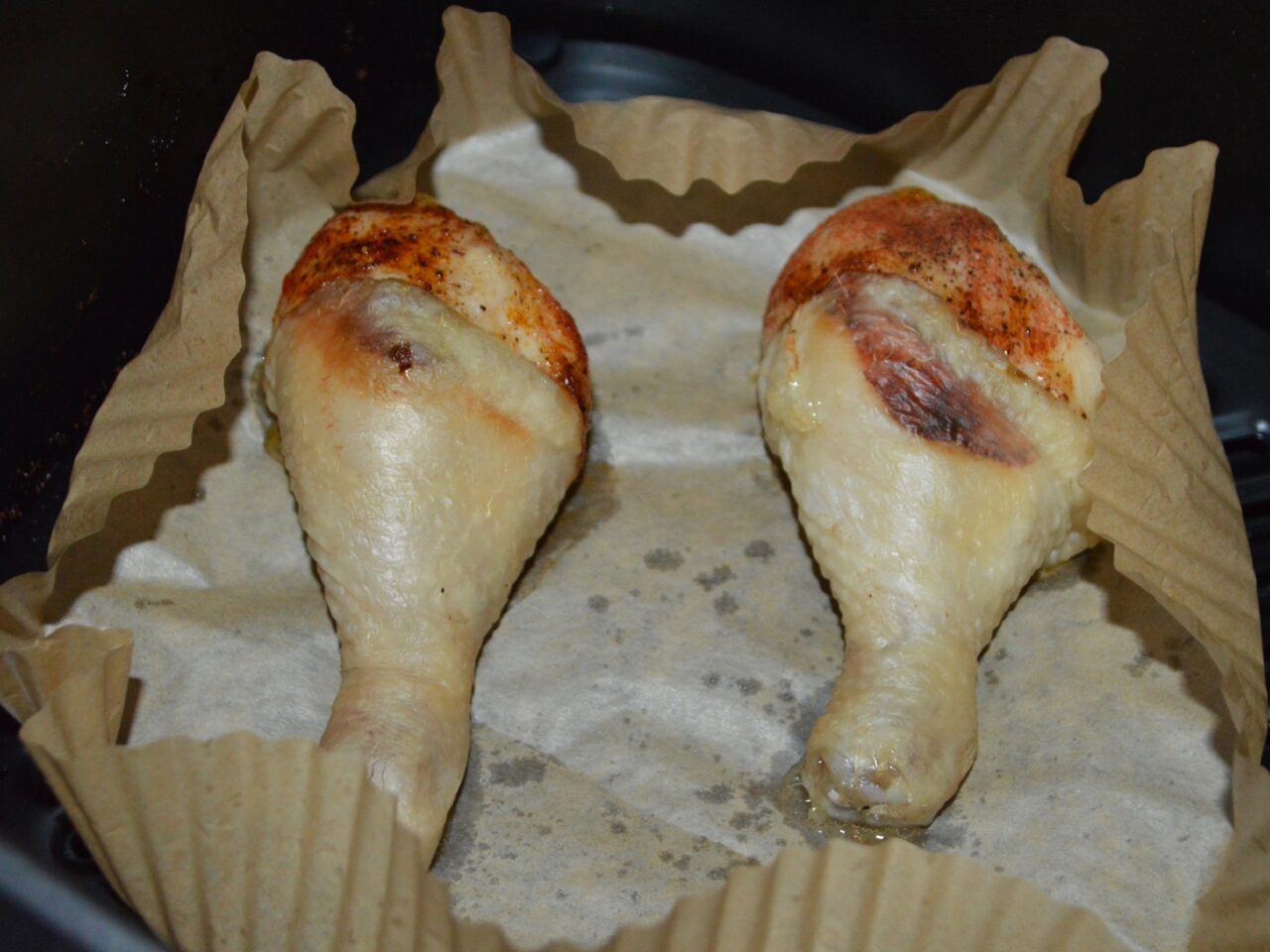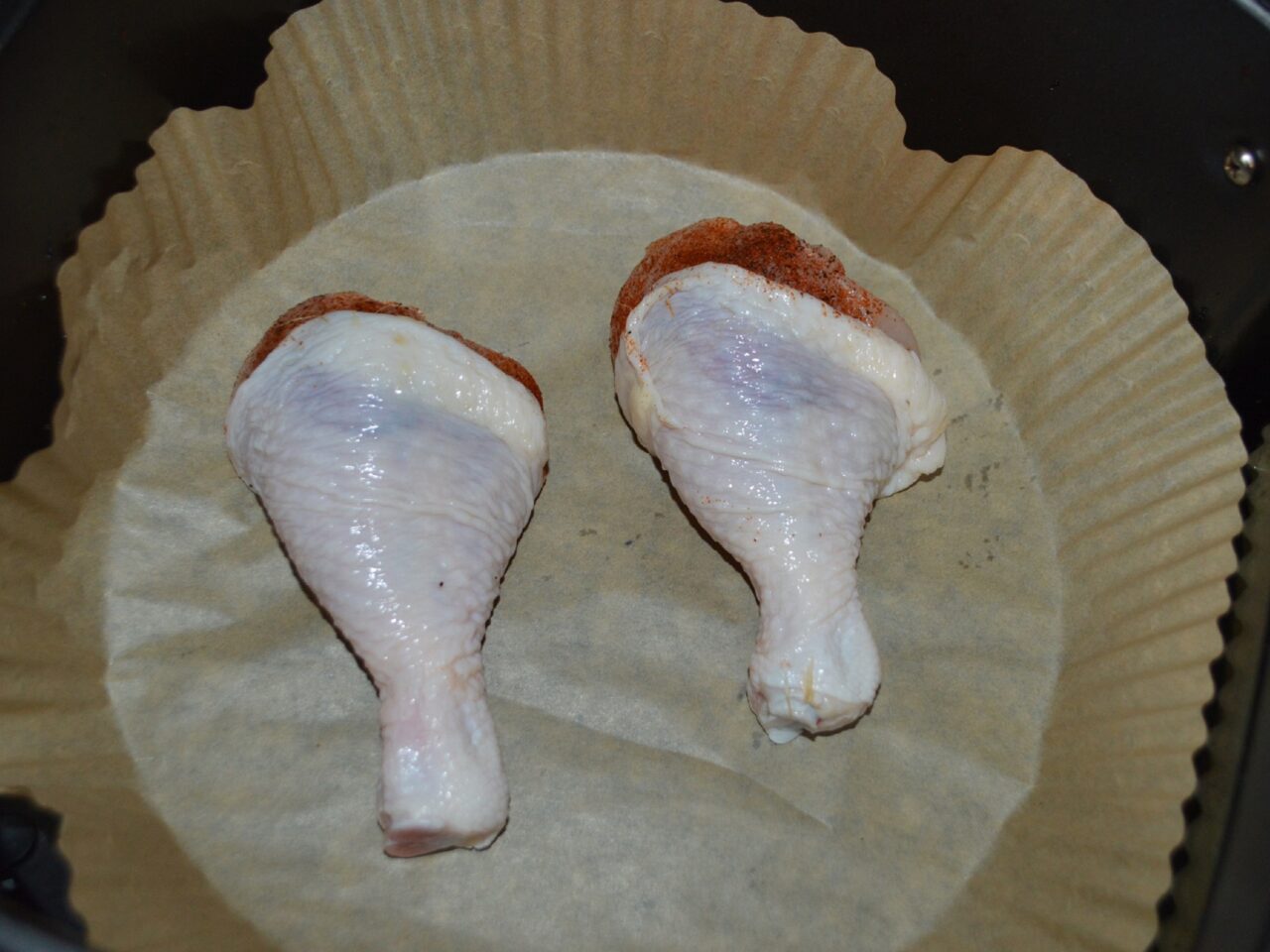 - Da-ti pielea la loc la pulpe, si transferati-le in Air Fryer pe o hartie de copt.