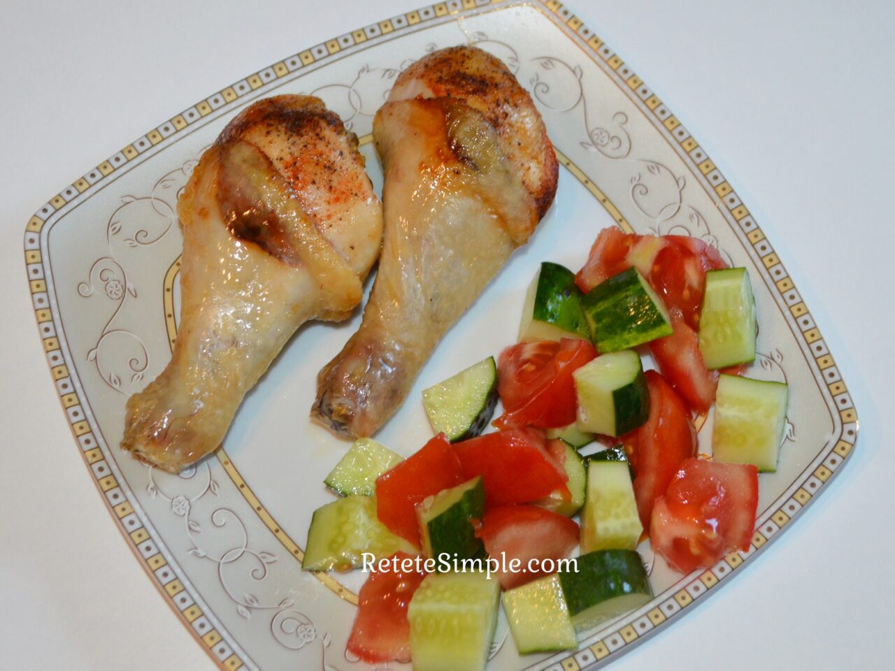 - Transferati pulpele pe o farfurie si serviti cu orice garnitura sau salata doriti, eu am ales salata de rosii si castraveti.