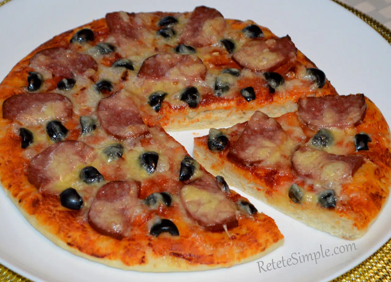 Pizza de casa cu blat pufos si cu umplutura de salam, masline si cascaval din aluat pe baza de apa. Aceasta reteta…