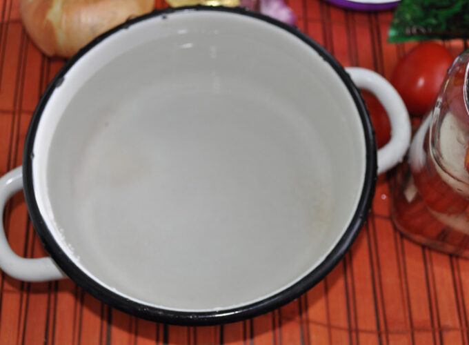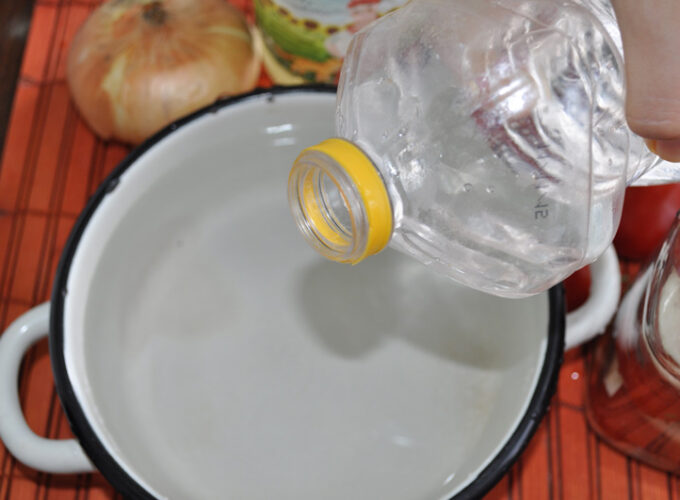 - Pentru a prepara marinada, se toarnă apă într-o cratiță.