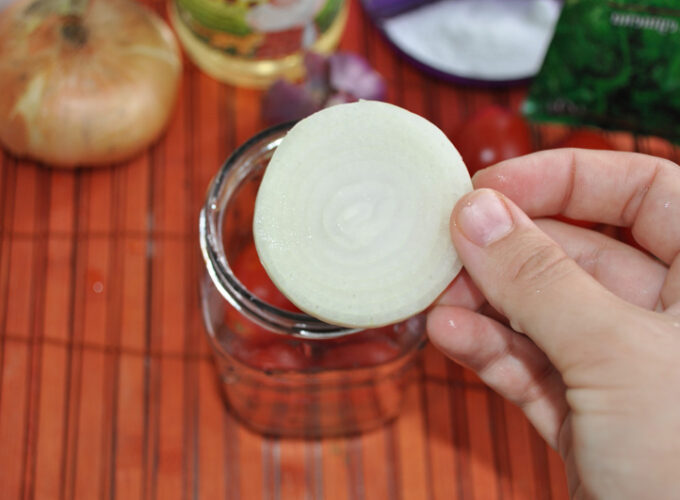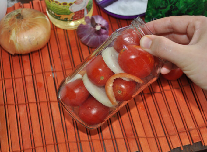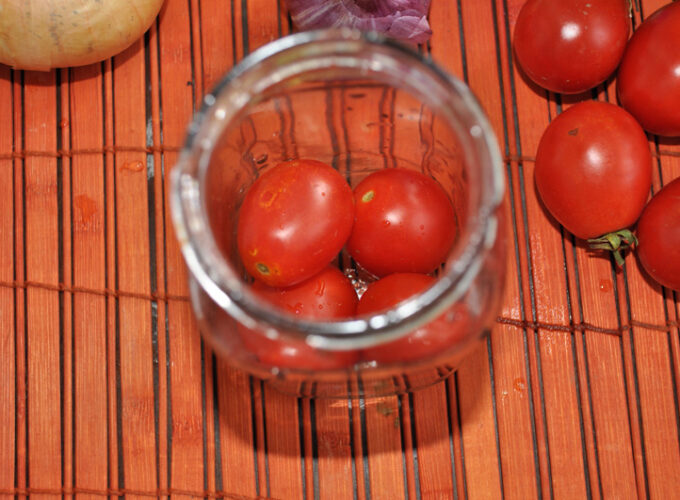 - Se curăță ceapa, ardeii și usturoiul. Se pun roșiile curate în borcane spălate.