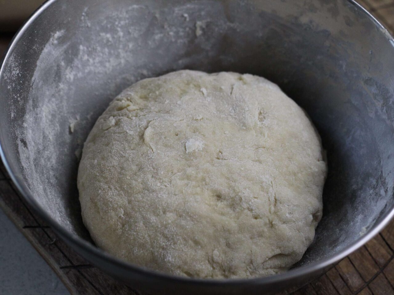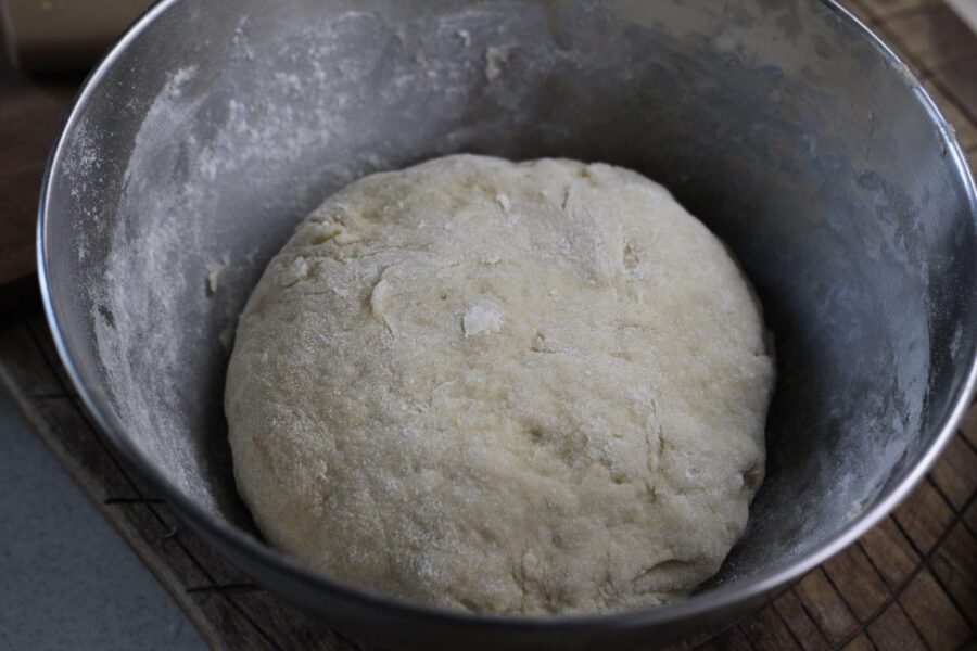 - Порционно всыпать муку, замешивая эластичное тесто. Муки может понадобиться меньше или же больше, в зависимости от ее структуры. Готовое тесто не должно прилипать к емкости. Накрыть тесто в емкости пленкой и отправить в тепло на полтора часа.