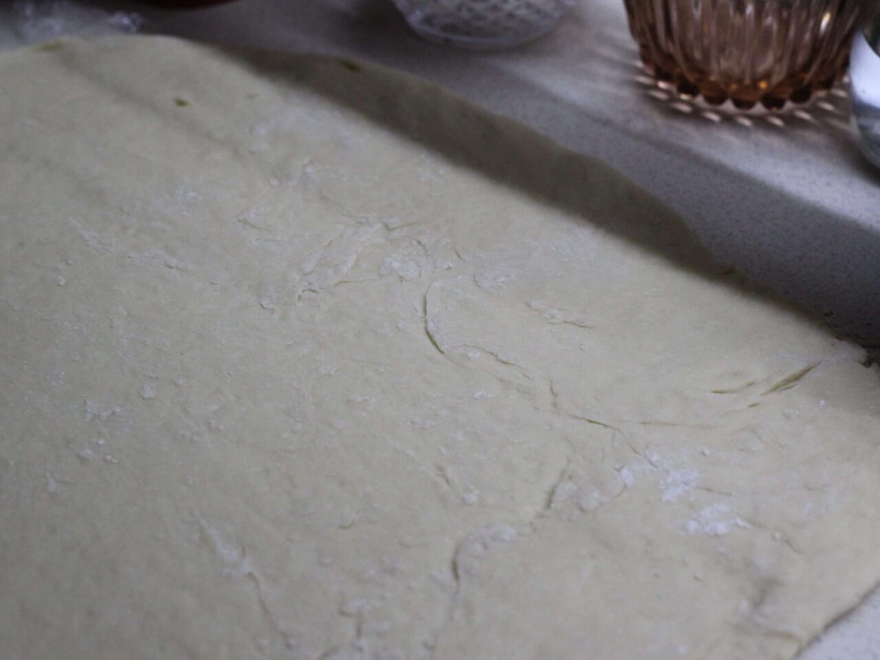 - Раскатать поднявшееся дрожжевое тесто в прямоугольник.