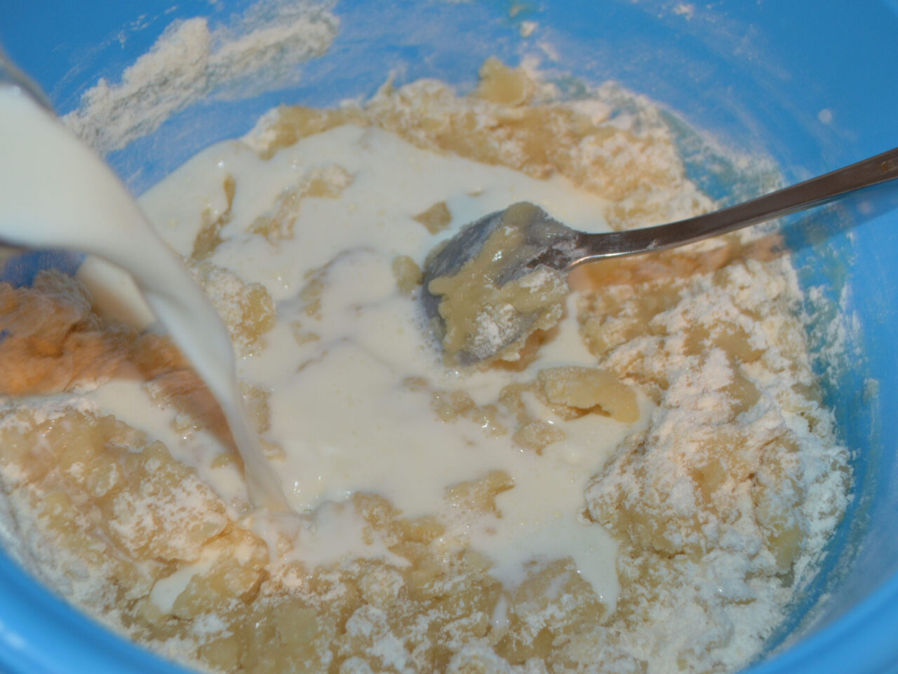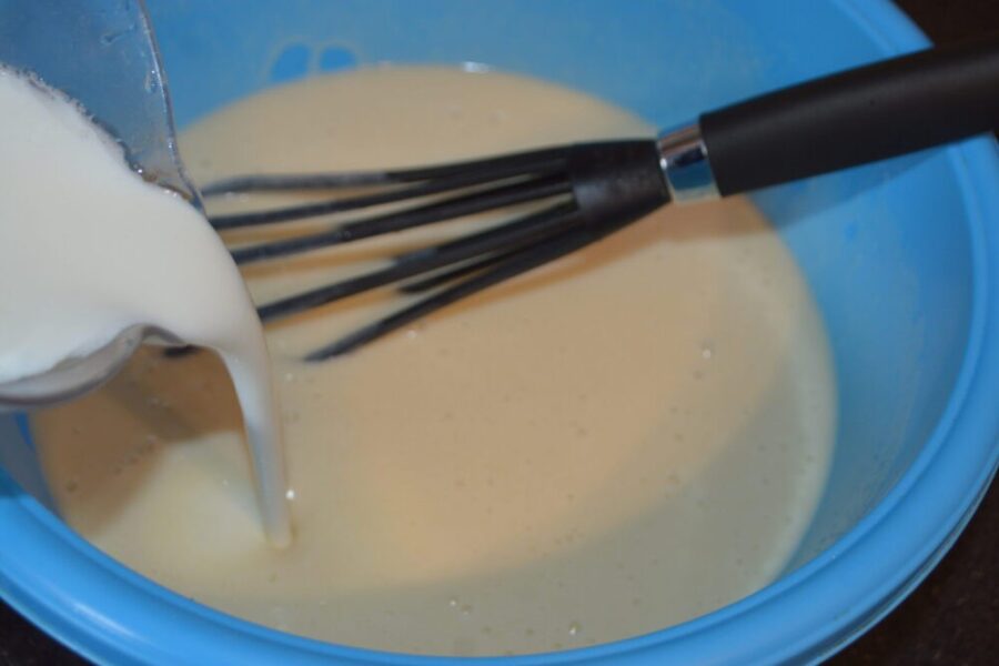 - Добавьте молоко и хорошо перемешайте венчиком.