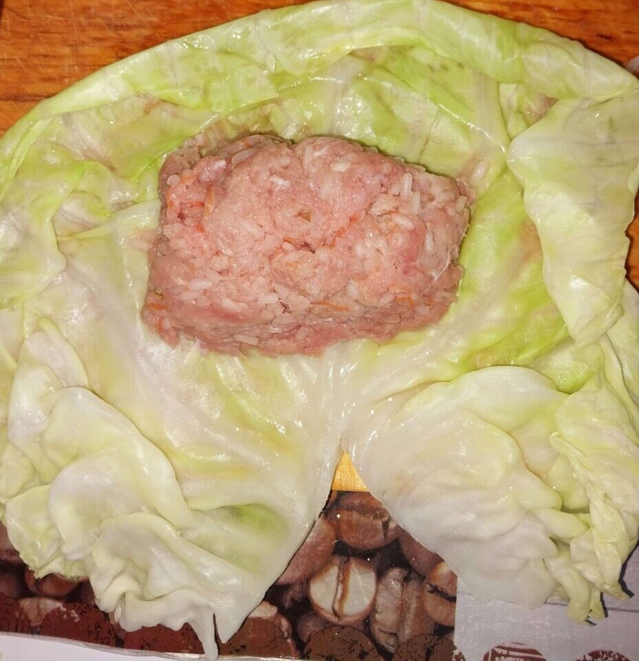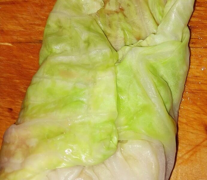 - С самого края вырезаем уголком плотную часть, которая крепилась к кочерыжке. Посередине кладем ложкой готовую массу с фаршем в форме прямоугольника.