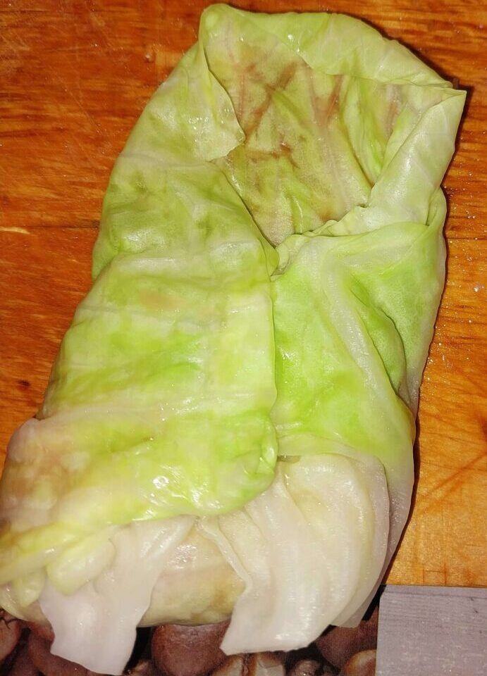 - Достаем деревянную кухонную доску. Кладем на нее лист капусты.