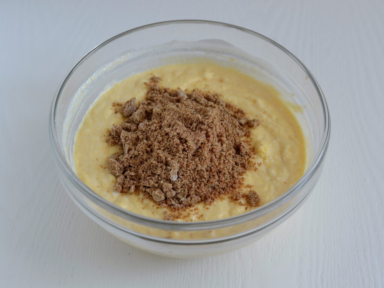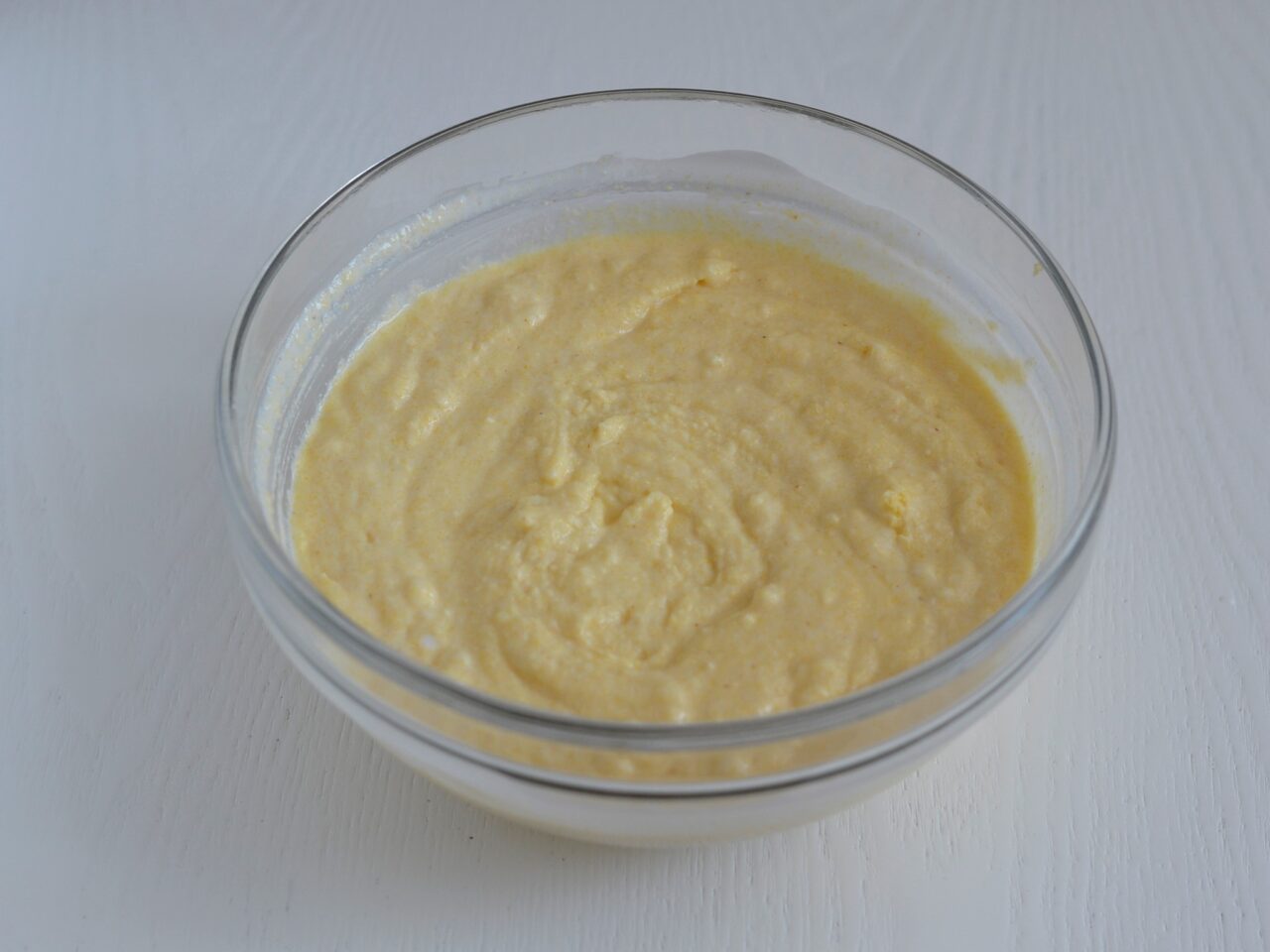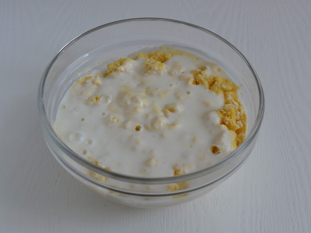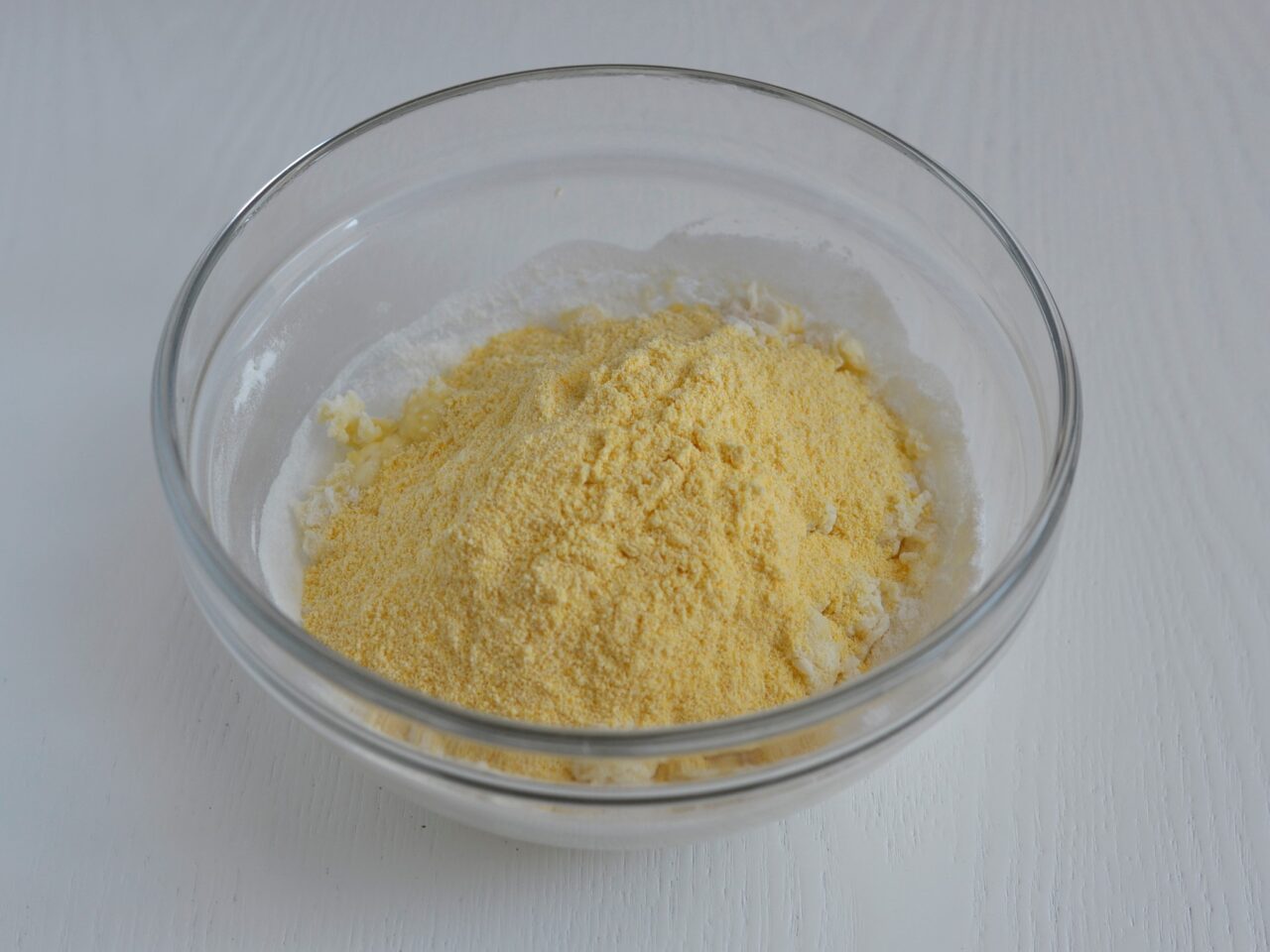 - Добавляем в чашу кукурузную муку и снова хорошо перемешиваем.