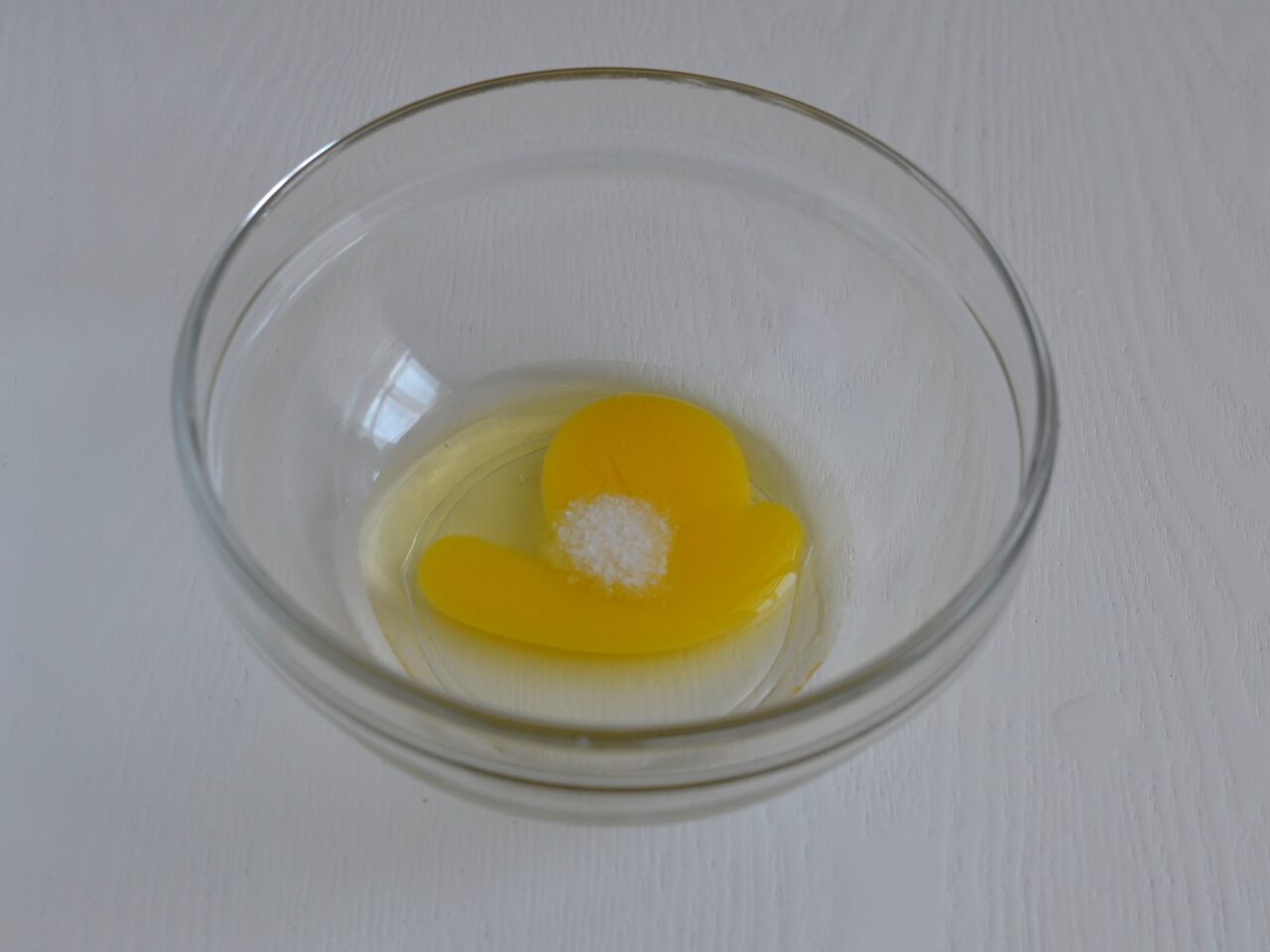 - В просторную чашу разбиваем яйцо, добавляем соль и немного взбиваем венчиком или вилкой.
