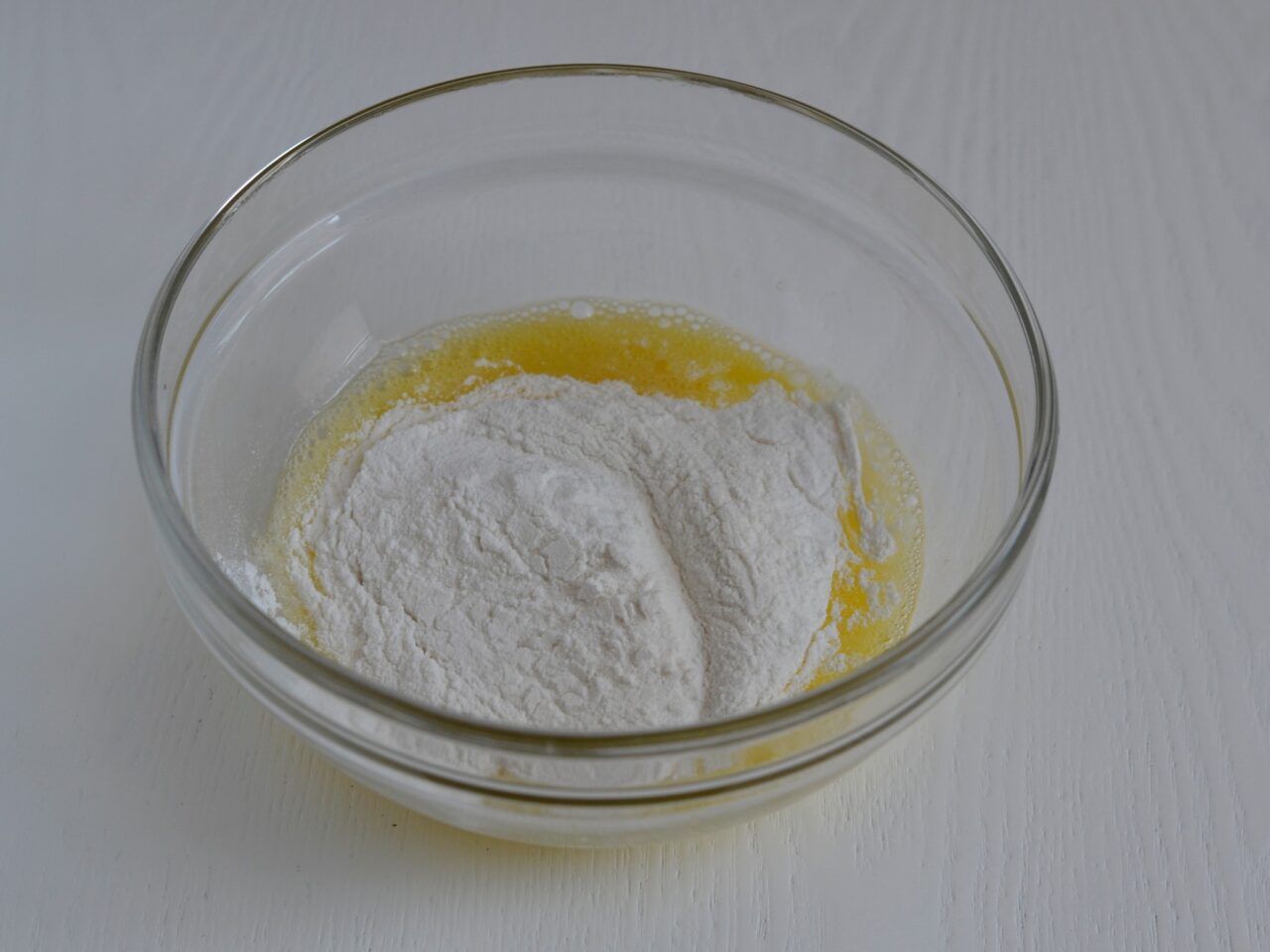 - Всыпаем рисовую муку и хорошо перемешиваем.