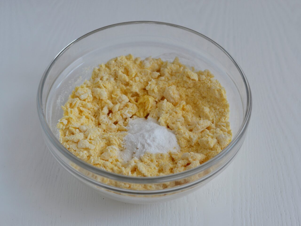 - Всыпаем разрыхлитель и снова перемешиваем массу.