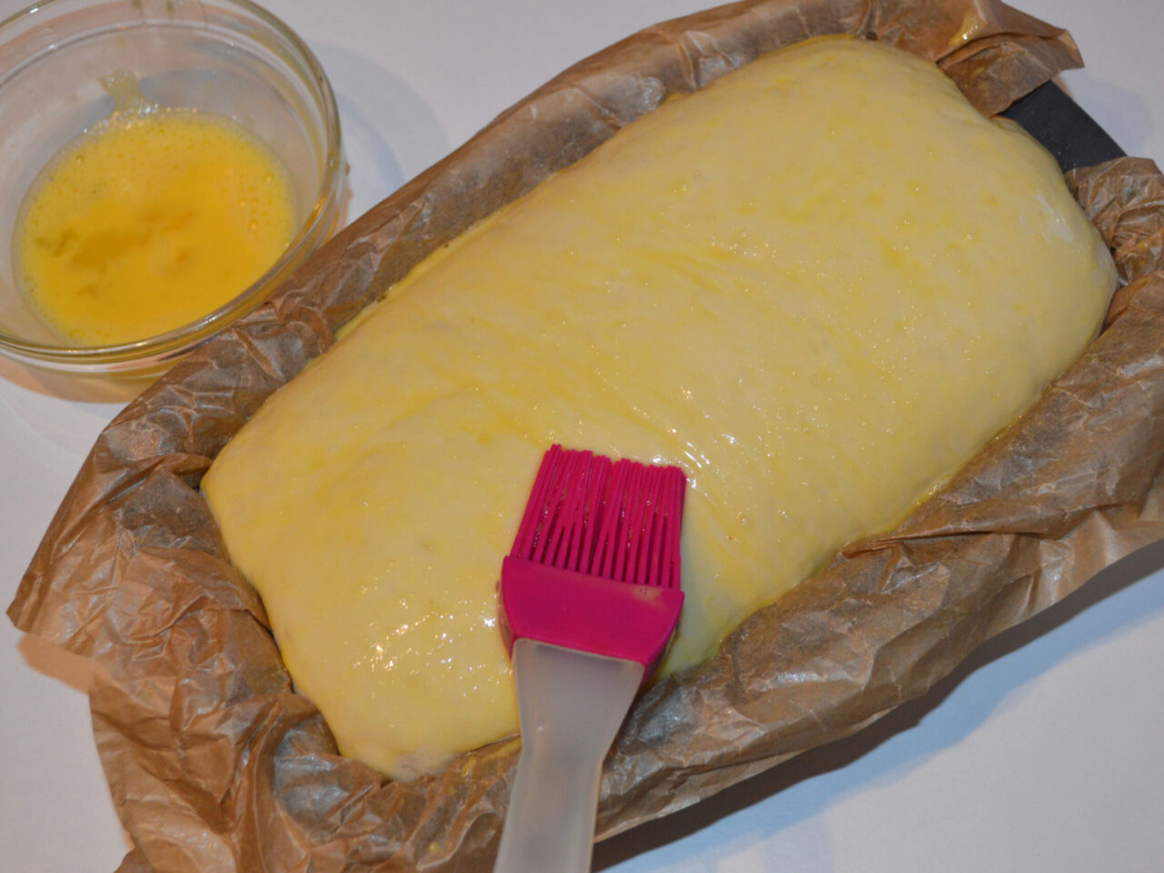 - Взбейте яйцо и смажьте хлеб с помощью кухонной кисти.