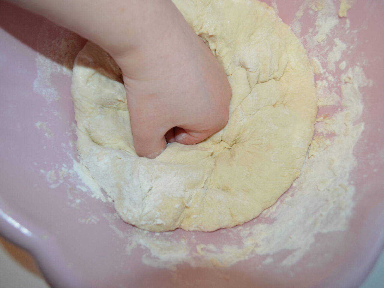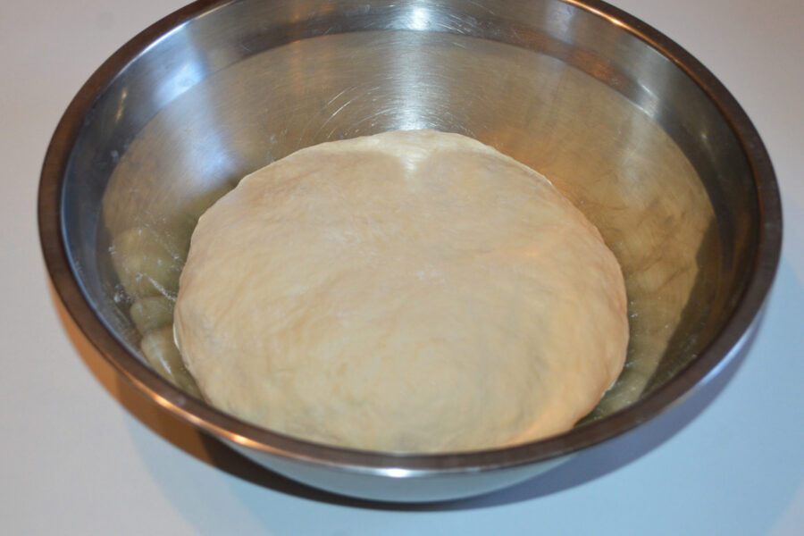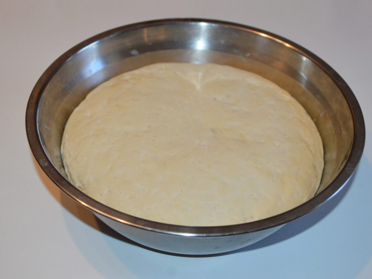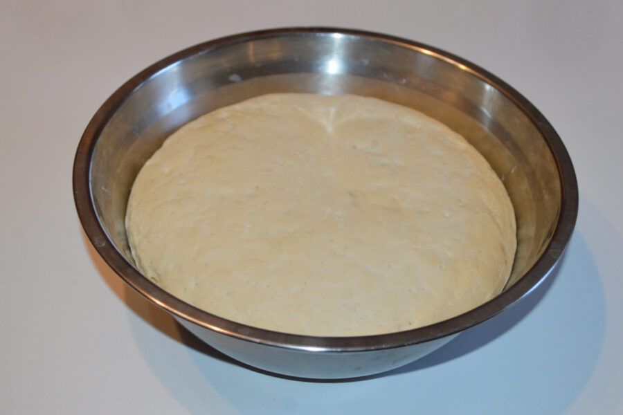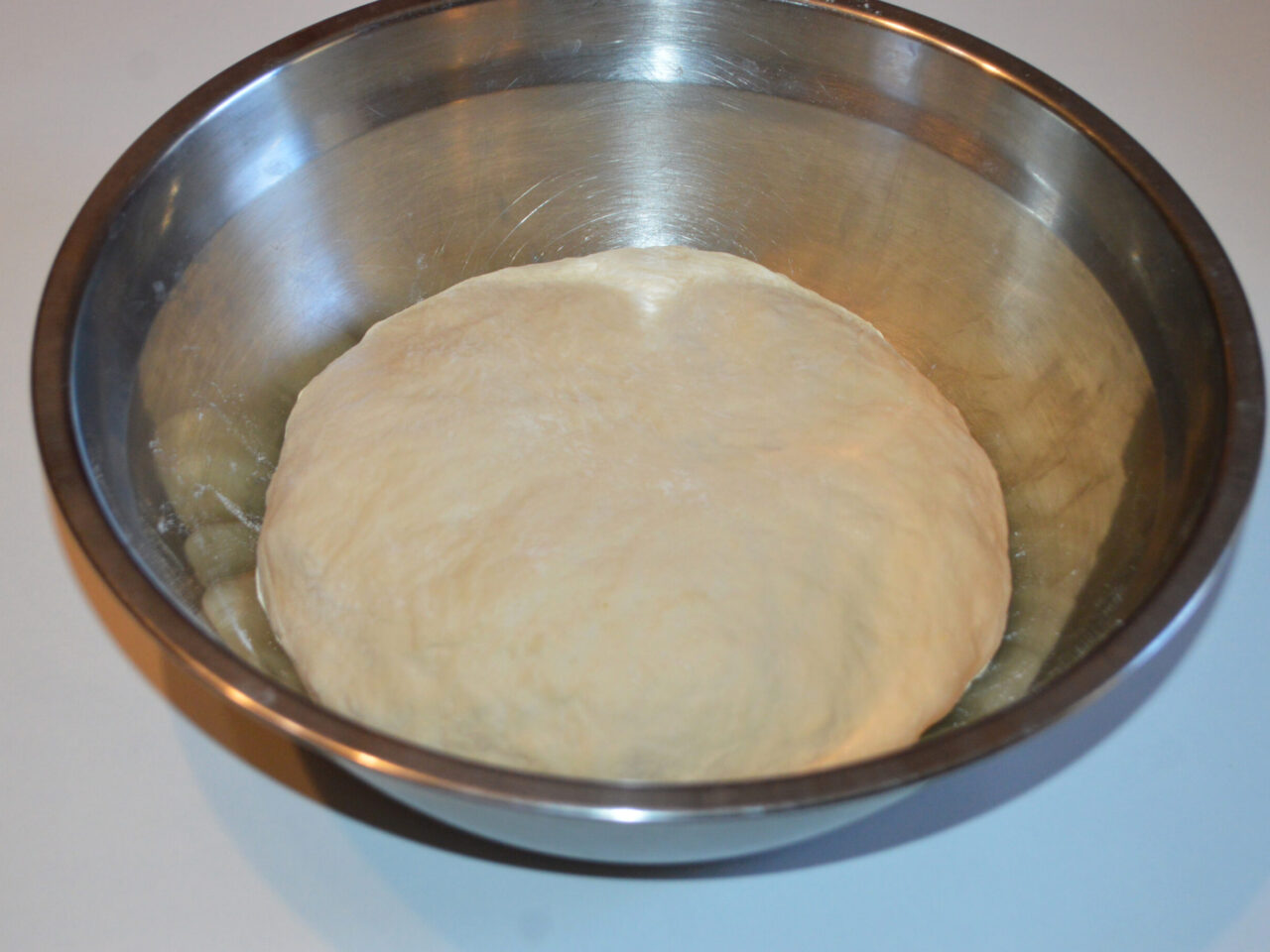 - Сформируйте из теста шар и переложите его в чистую сухую миску, посыпанную небольшим количеством муки. Накройте миску полотенцем и оставьте подниматься в теплом месте на час.