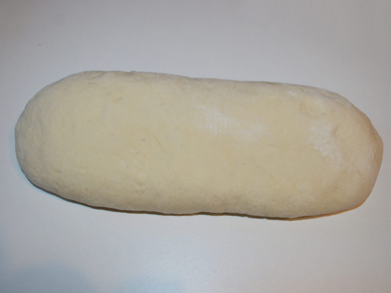 - Переложите тесто на стол, присыпанный мукой, и еще немного вымесите его. Придайте хлебу желаемую форму, я предпочла сделать батон, но при желании можно разделить и заплести косичку, или же сделать его в круглой форме.
