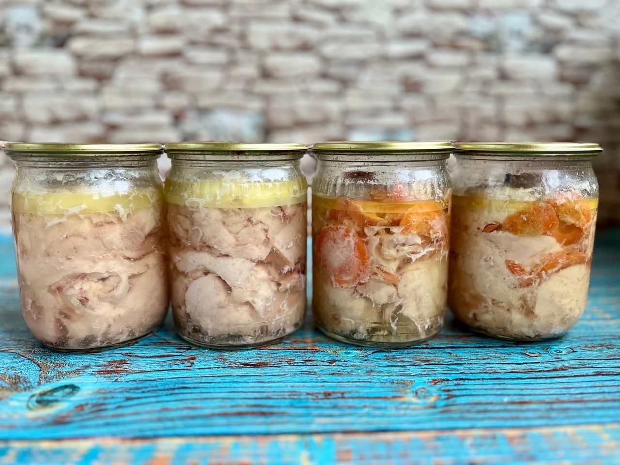 Из курицы-бройлера весом около 1,5 кг выходит две полулитровые банки отличной домашней тушенки. При этом суповой набор из куриной спинки и шеи идет, как говорится, «в подарок». Для экономии времени и ресурсов целесообразно готовить тушеное куриное мясо сразу из двух тушек птиц, т.к. в большую кастрюлю объемом 5 литров устанавливаются 4 баночки.