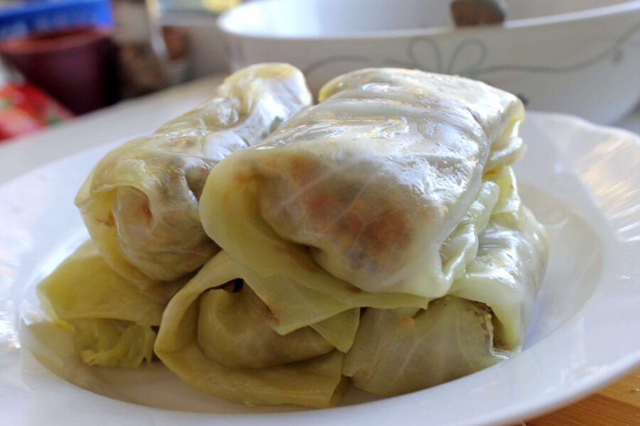 - На этом этапе я включаю духовку, выставив таймер на 200 градусов, формирую продолговатые шарики и выкладываю их на капустные листья. Внимание: лучше обрезать утолщения на листьях или отбить их слегка тяпочкой.