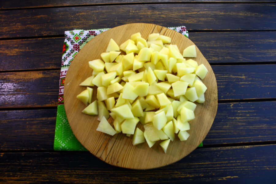 - Картофель (очищенный) измельчают небольшими кусочками.