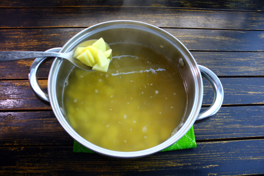 - Картофель добавляют в кастрюлю с горохом и варят десять минут.