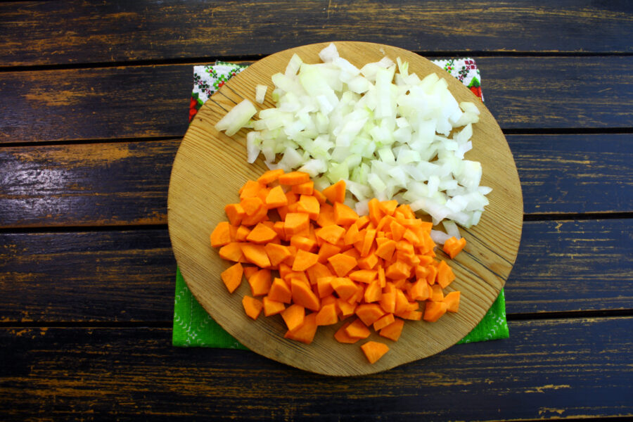 - Очищенную морковь измельчают маленькими ломтиками, а лук (очищенный) – кубиками.