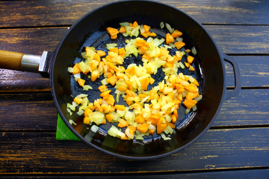 - Масло разогревают в сковороде и обжаривают лук с морковью до золотистости.