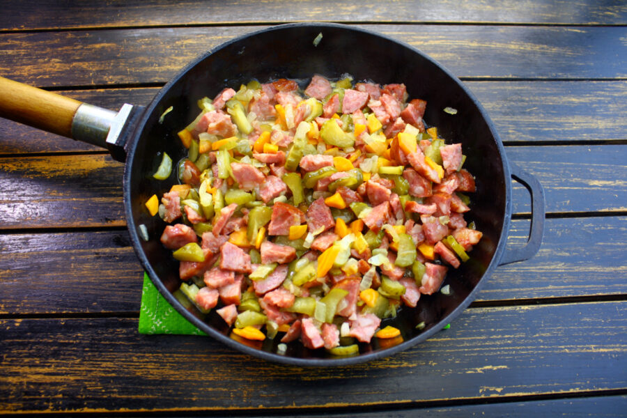 - Добавляют в сковороду к зажарке огурцы и колбасу.