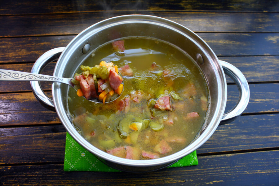 Секрет насыщенного вкуса этого супа кроется в аппетитной зажарке: мы обжариваем копченую колбасу с морковью, луком и маринованными огурцами. Эта смесь придаёт супу глубокий вкус и приятный аромат копчёностей. Маринованные огурчики прекрасно гармонируют с остальными компонентами, добавляя блюду лёгкую, освежающую кислинку.