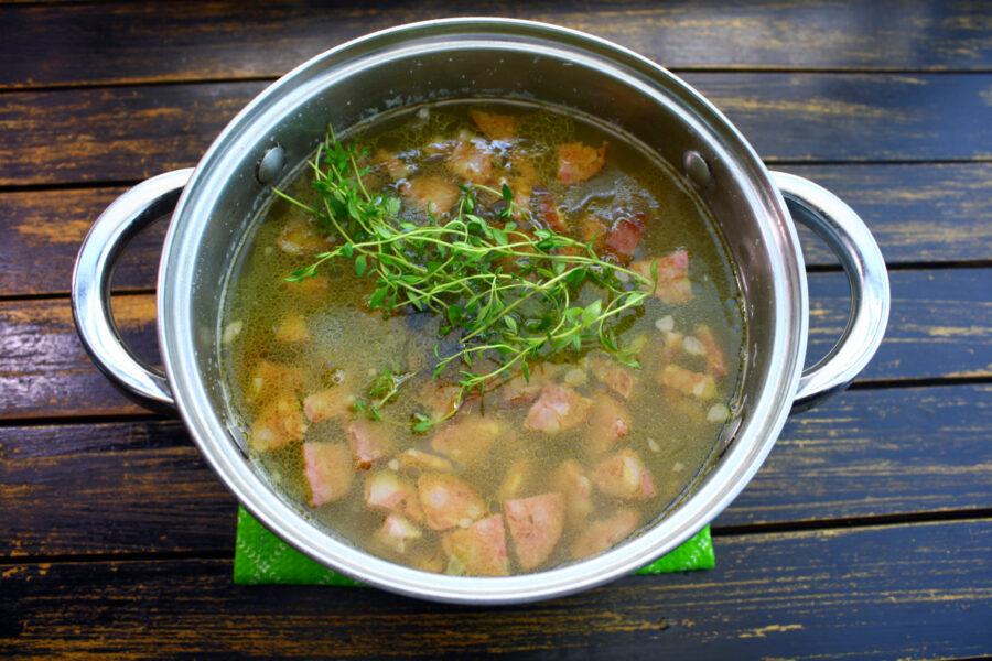 - Варят суп пять минут. Выключают нагрев и вынимают пучок тимьяна из супа.