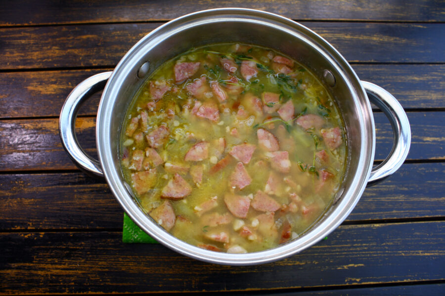 Вам не понадобится много времени на приготовление, ведь здесь не нужно отваривать мясо. А вся питательность и насыщенность супа обеспечивается копченой колбасой.