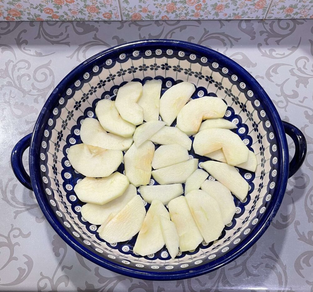 - На яблоки – слой печени. Равномерно поливаем соевым соусом.
