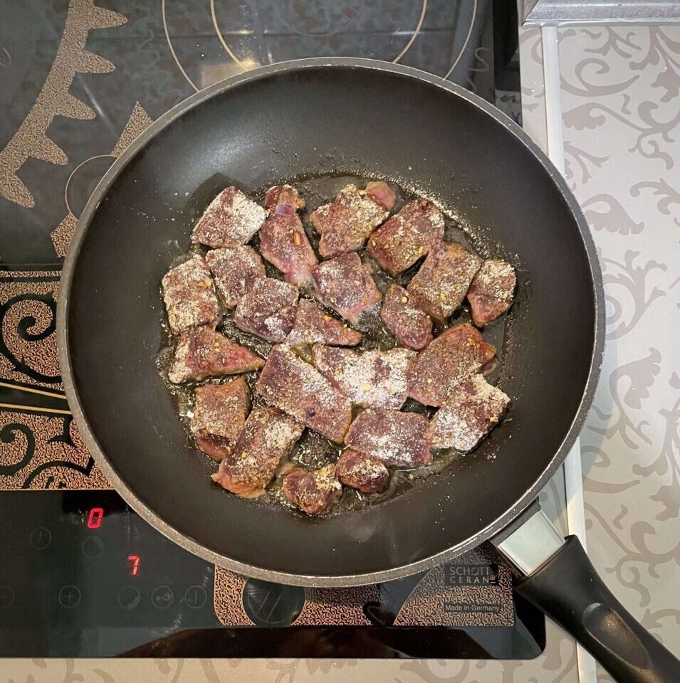 - Наливаем столовую ложку оливкового масла в сковороду. Выкладываем печень, обжариваем по одной минуте с каждой стороны.