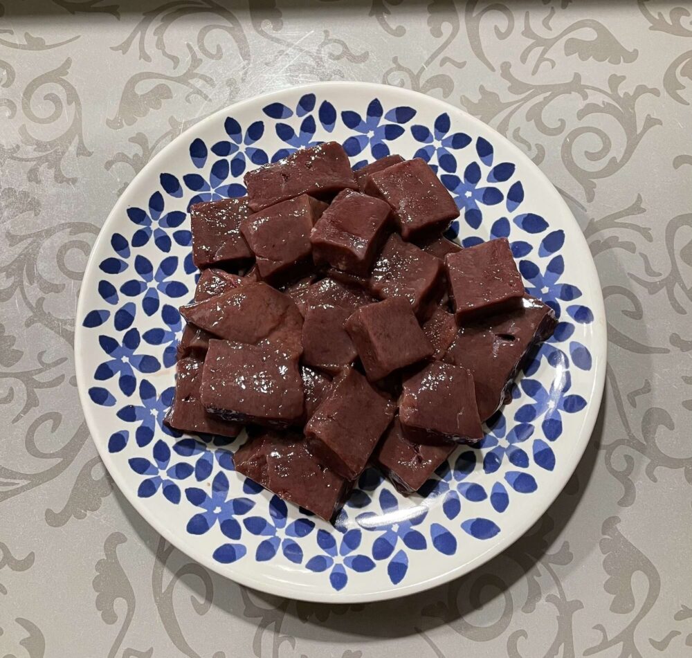 - С охлажденной печени снимаем пленку, срезаем прожилки, удаляем желчные протоки. Промываем, высушиваем бумажным полотенцем. Нарезаем на кубики. В миске смешиваем муку с солью, перцем и приправой. Обваливаем в смеси каждый кусочек.